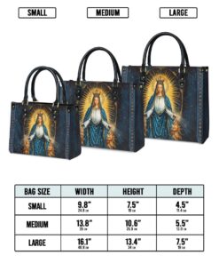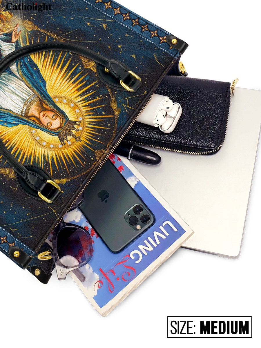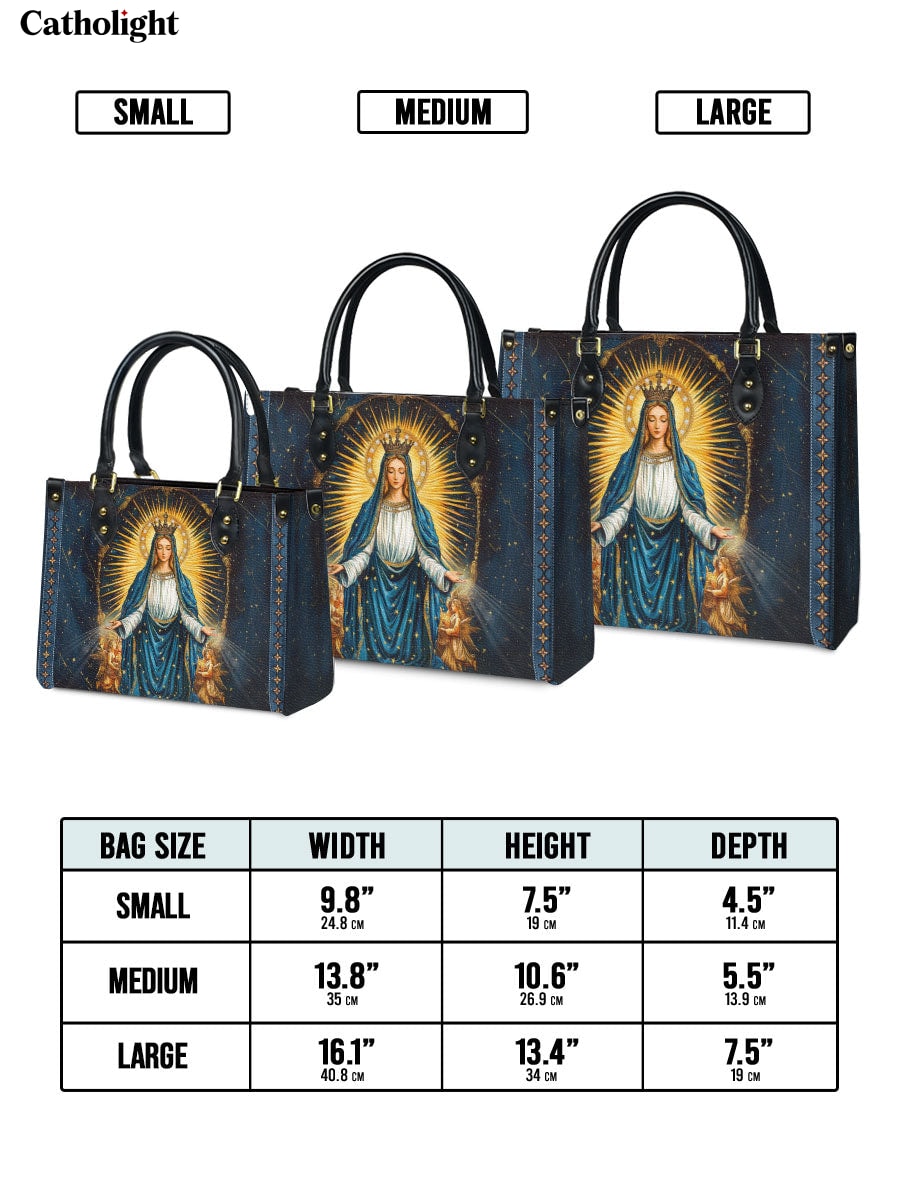 This elegant leather bag features a breathtaking portrayal of the Blessed Virgin Mary surrounded by a radiant golden aura, symbolizing her divine role as the Queen of Heaven. Dressed in flowing blue and white robes, Mary’s serene expression conveys grace, peace, and maternal love. Two angelic figures kneel in reverence at her feet, emphasizing her celestial authority and compassionate intercession. The rich midnight-blue background adorned with delicate golden accents reflects the infinite beauty of heaven, making this leather bag a timeless expression of faith and devotion.