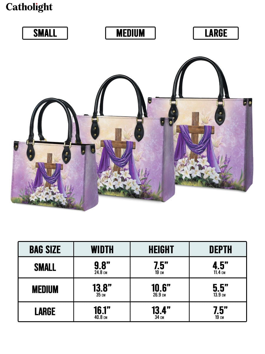 This elegant leather bag features a beautiful depiction of the Cross, adorned with a flowing purple cloth symbolizing Lent and Easter’s sacred promise of redemption. Surrounding the Cross are white lilies, representing purity and resurrection, and lavender flowers, evoking peace and devotion. The soft purple background adds a serene touch, creating a timeless expression of faith and hope. Crafted with care, this bag is both a meaningful accessory and a daily reminder of Christ’s love and sacrifice.