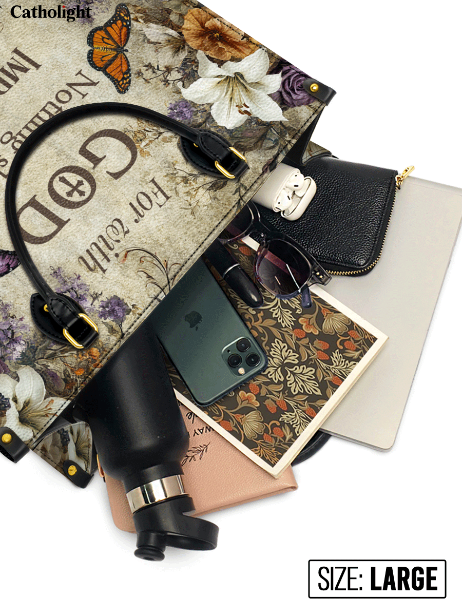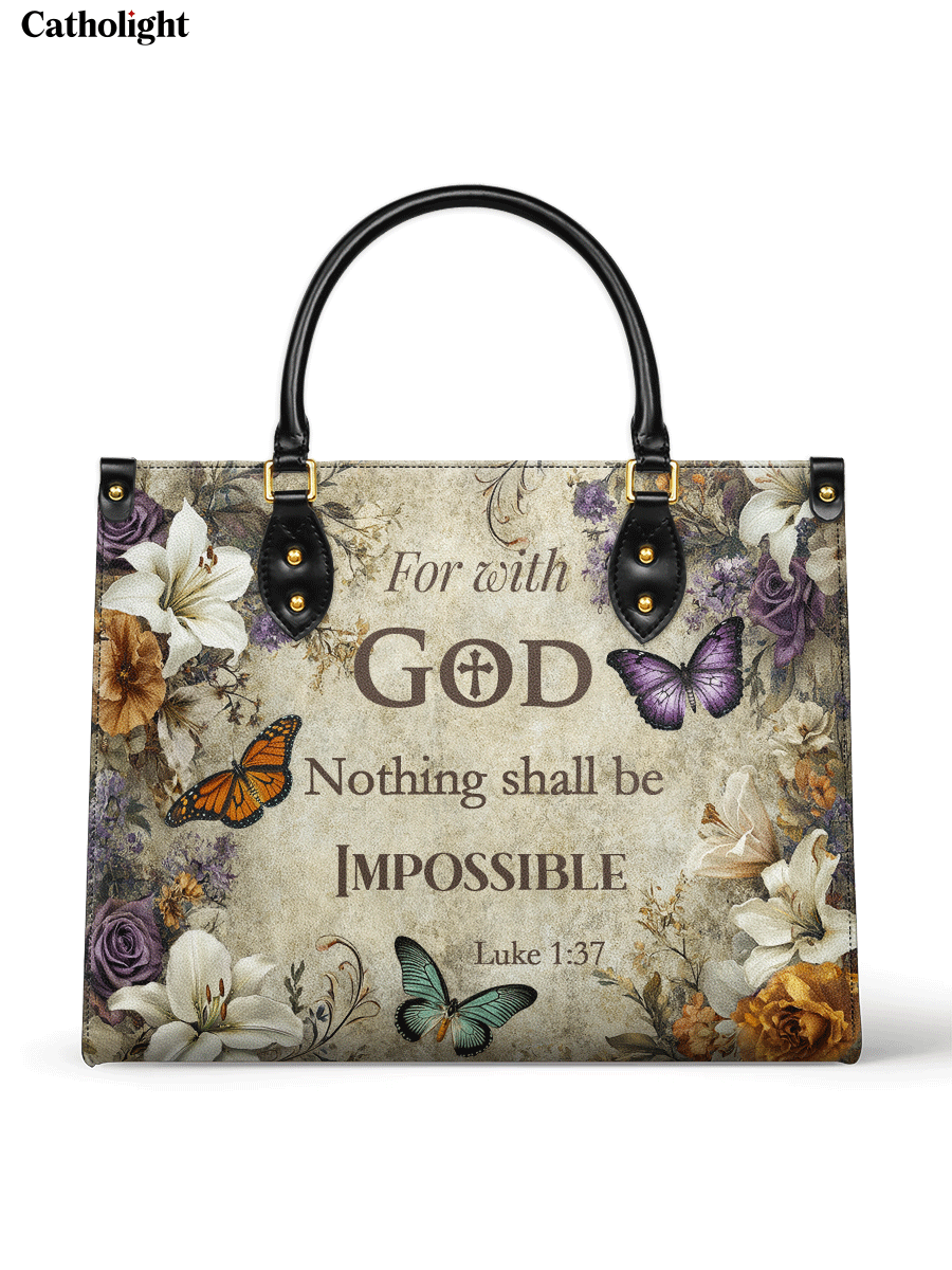 Celebrate unwavering faith with this inspiring leather bag, beautifully adorned with a powerful message from Luke 1:37: “For with God, nothing shall be impossible.” This declaration of hope and strength is gracefully surrounded by a delicate floral arrangement featuring soft lilies, symbolizing purity and renewal, and golden blossoms that exude warmth and divine love.