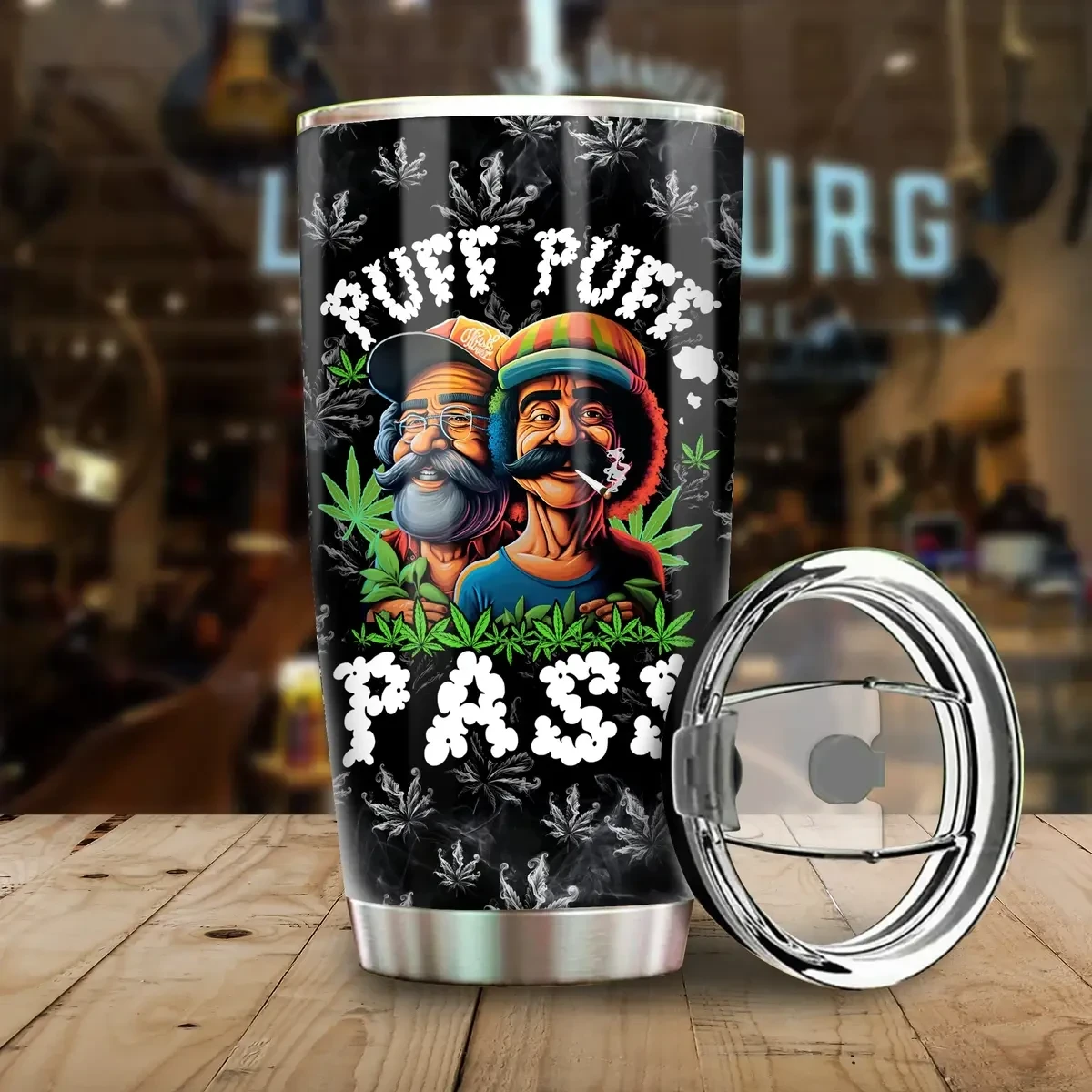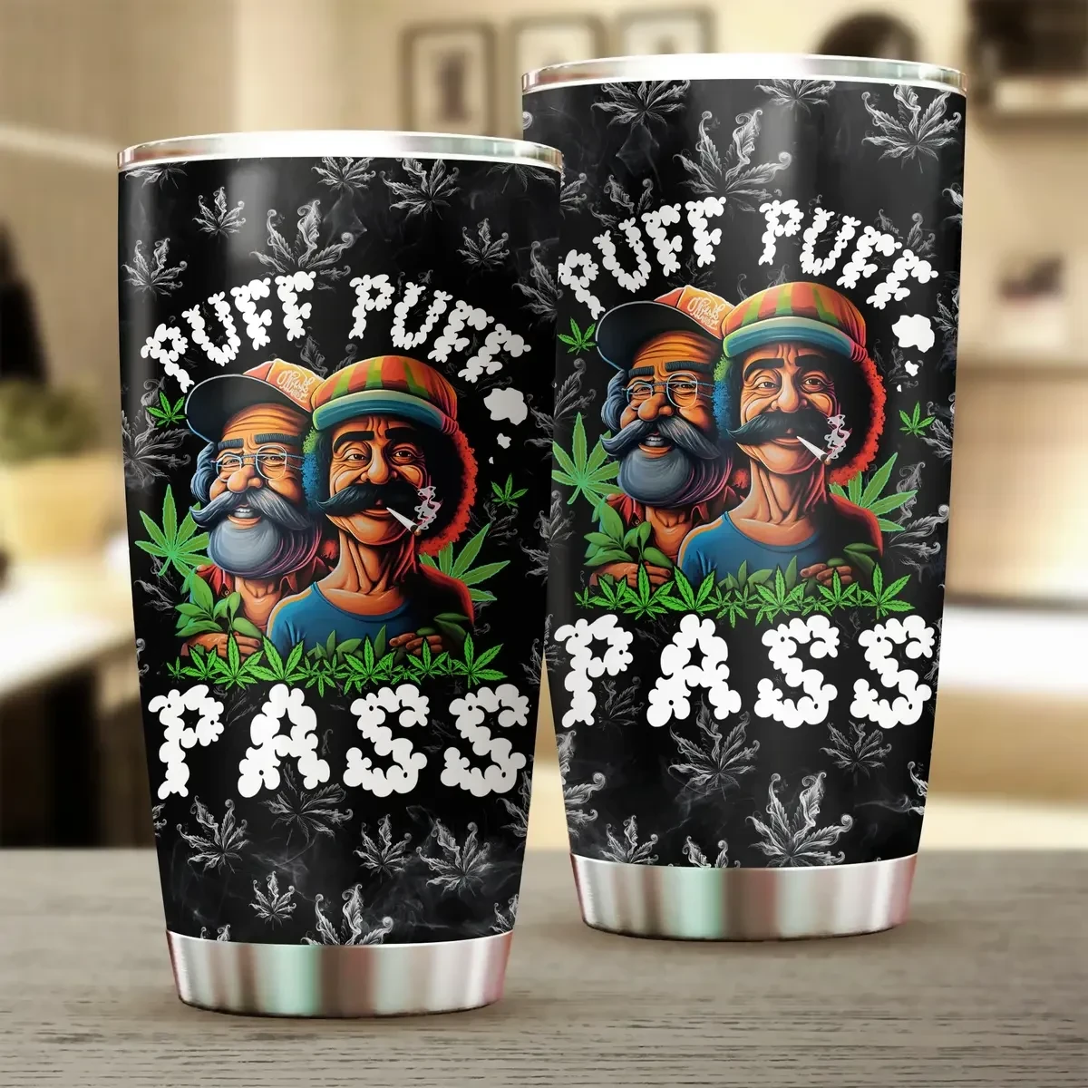 Puff Puff Pass Tumbler – Funny Weed Smoking Cup with Cannabis Design