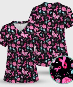 Breast Cancer Awareness Scrub – Warrior Survivor Hope & Pink Ribbon Top – Gift for Women RN LPN CNA